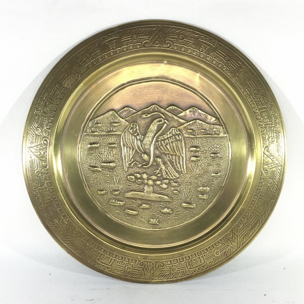 • Robusto Medalhão em metal amarelo no requinte Maia, decorado com imagem de ave e serpente ao centro, ladeado por faixa estilizada. Dimensões: 28 cm diâmetro.