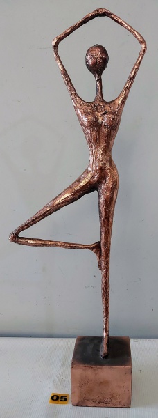 • Belíssima bailarina de grandes dimensões ricamente elaborada em resina com trabalho metalizado em cobre, base de madeira, medindo aproximadamente 62 cm de altura.