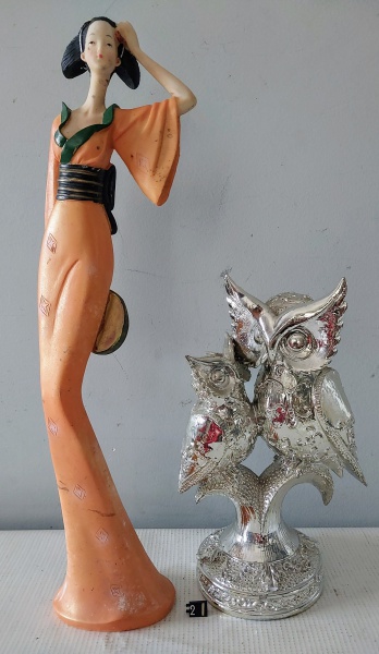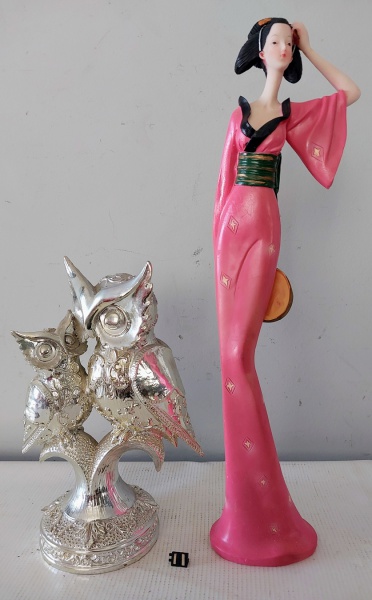 • Conjunto composto por duas esculturas distintas: uma figura de gueixa em resina, e outra par de corujas prateadas (mãe com filhote) em resina. Ambas as peças exibem detalhes finos em suas expressões e trajes, cada uma com características únicas que enriquecem o conjunto. A escultura maior possui altura de 40 cm e a outra 23cm. Ideal para colecionadores e apreciadores de arte decorativa com toque clássico.