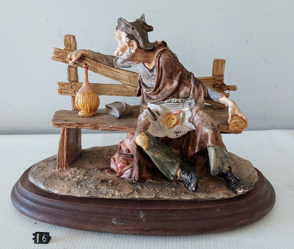 • Belíssima estatueta em resina italiana representando um andarilho morador de rua lanchando no banco da praça, com base em madeira, ricamente detalhado, medindo 19cm de altura por 14cmX 28cm de base.