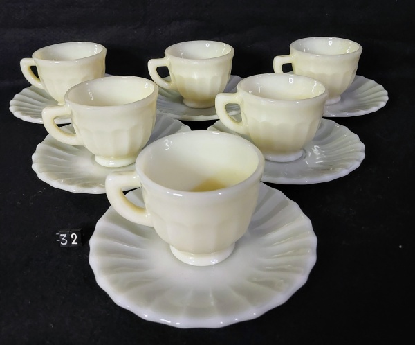 • Conjunto para café composto por 12 peças, em vidro leitoso Colorex, detalhes em canelado fino, sendo seis xícaras e seis pires, em ótimo estado. Med. Pires: Diâm. 11 cm. Xícaras: 6 cm.