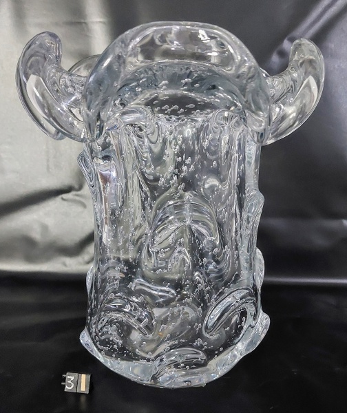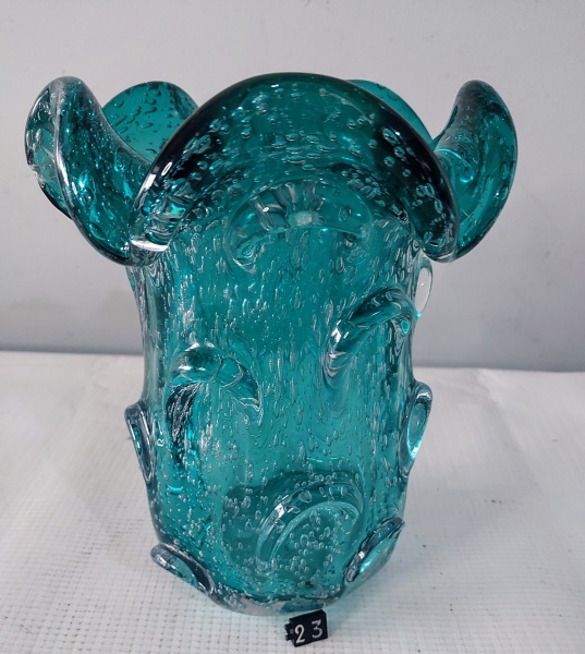 • Lindo vaso em vidro de murano, anos 50, série cacto, na cor transparente, bordas em movimento, decorado com bolhas internas. Altura 17cm de altura por 15cm aproximadamente.