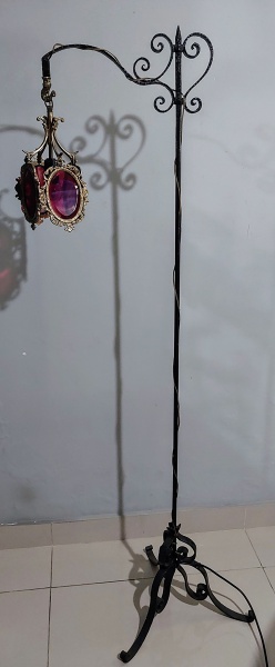• Luminária de chão, em ferro com pé tripóide e braço trabalhados, cúpula quadrada em bronze com vidros bisotados vermelhos. Mede 158 cm de altura.