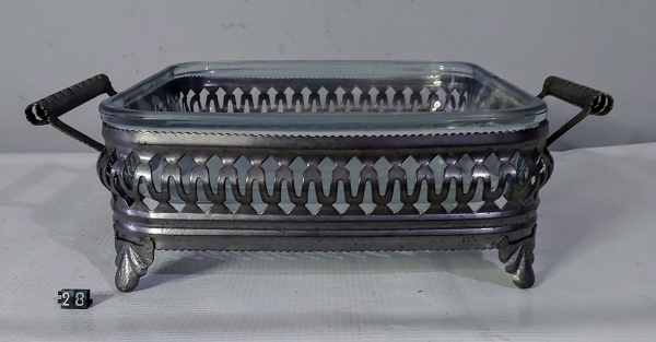 • Antiga peça em metal prateado fenestrado, sendo richaud sem fogareiro, com pirex sem tampa. Pequenas marcas de uso. Med. do maior 9x31x24,5cm.