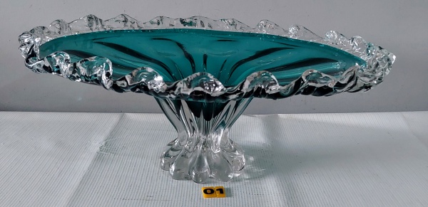 • Grande e belíssimo centro de mesa de grandes dimensões na cor Azul, formato diferenciado com bordas apresentando babado na cor translucida elaborado em vidro artístico, forjado e repuxado a partir de movimentos manuais e de sopro. Utilizando a técnica da criação de vidros artísticos estilo de Murano, medindo 18x43x36cm aproximadamente.