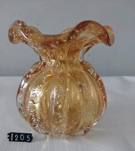 • Lindo centro de mesa no formato de trouxinha, ricamente elaborado em vidro artístico na cor ambar, com gomos e profusão de bolhas, soprado e forjado partir de movimentos manuais e de sopro. Utilizando a técnica da criação de vidros artísticos de Murano, medindo 12 cm x 11 cm aproximadamente.