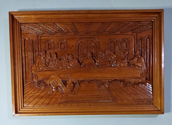 • Exuberante este quadro Santa Ceia em madeira nobre entalhada a mão detalhadamente. Assinado Zezé e datado 1999. Medindo: 60 cm alt x 87 cm comp